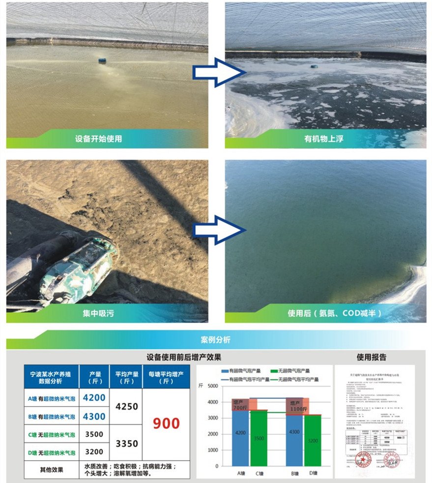 结论: 案例表明,我司超微纳米气泡装置可在短期内改善养殖环境,降低COD、氨氮、亚硝酸盐等指标,海水水质提升效果显著,为案例客户平均亩产增产20%左右。